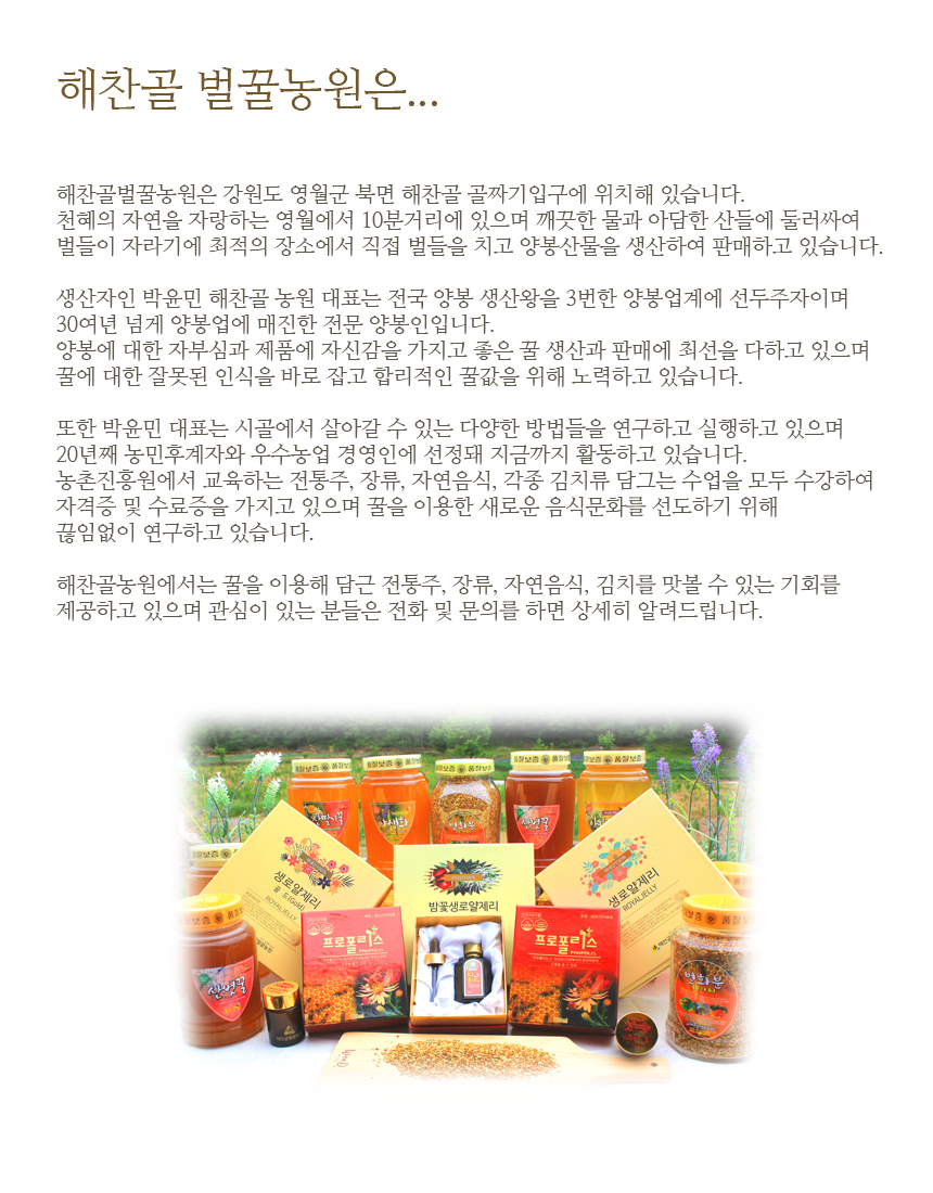 회사명 : 해찬골 | 사업자등록번호 : 225-03-33514 [사업자정보확인] | 주소 : 강원도 영월군 북면 강구길 145-53 해찬골벌꿀농원